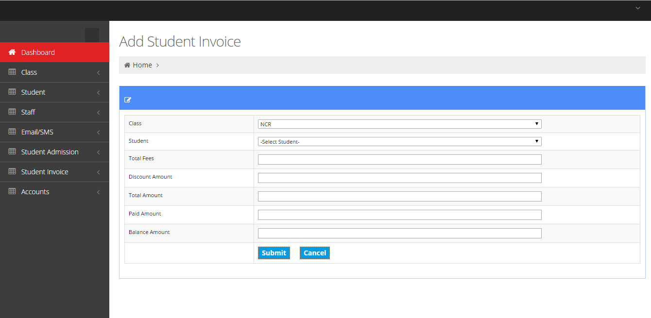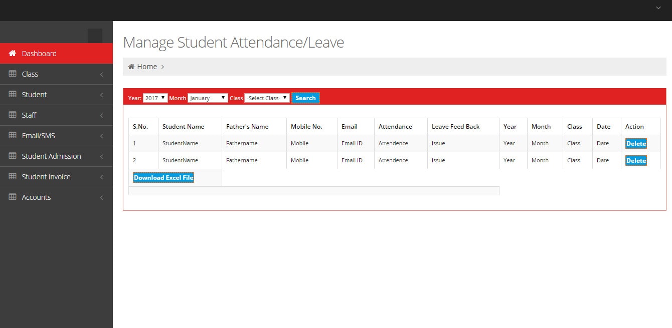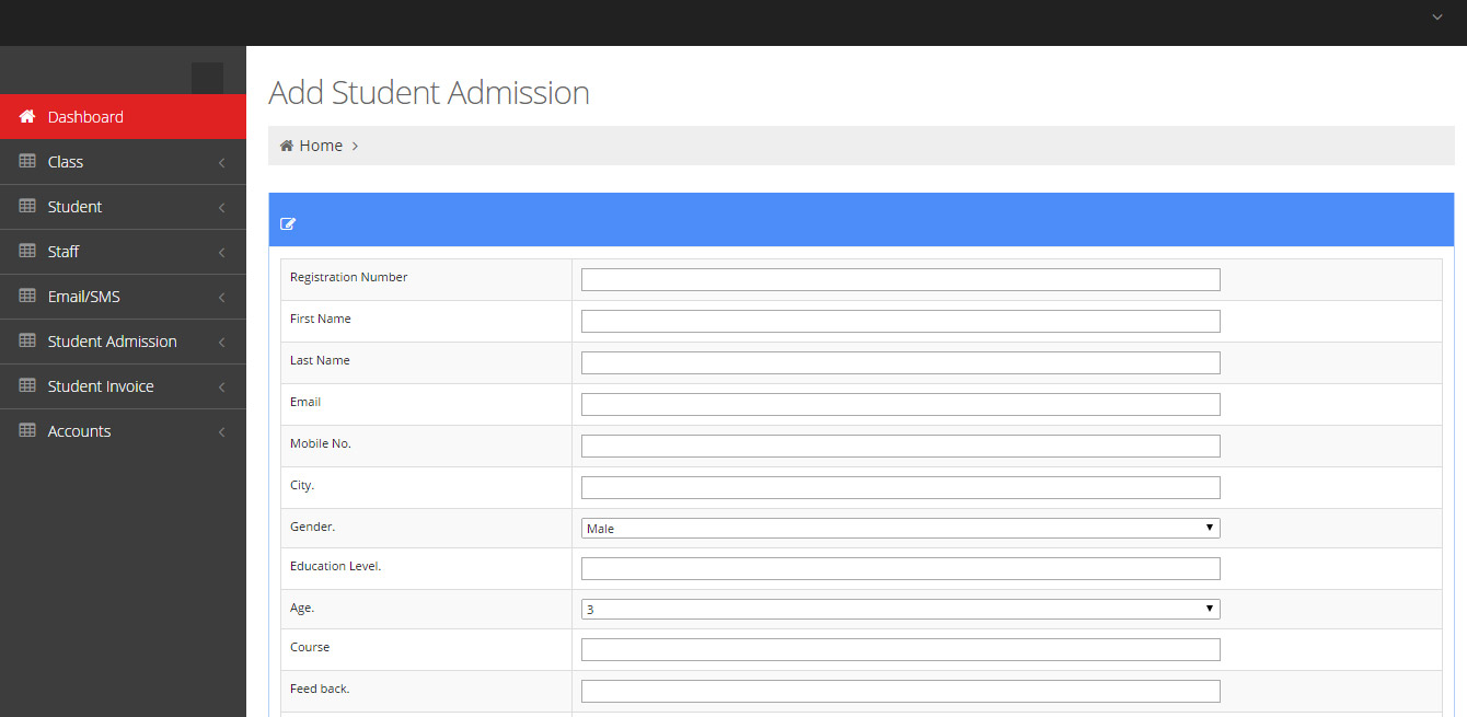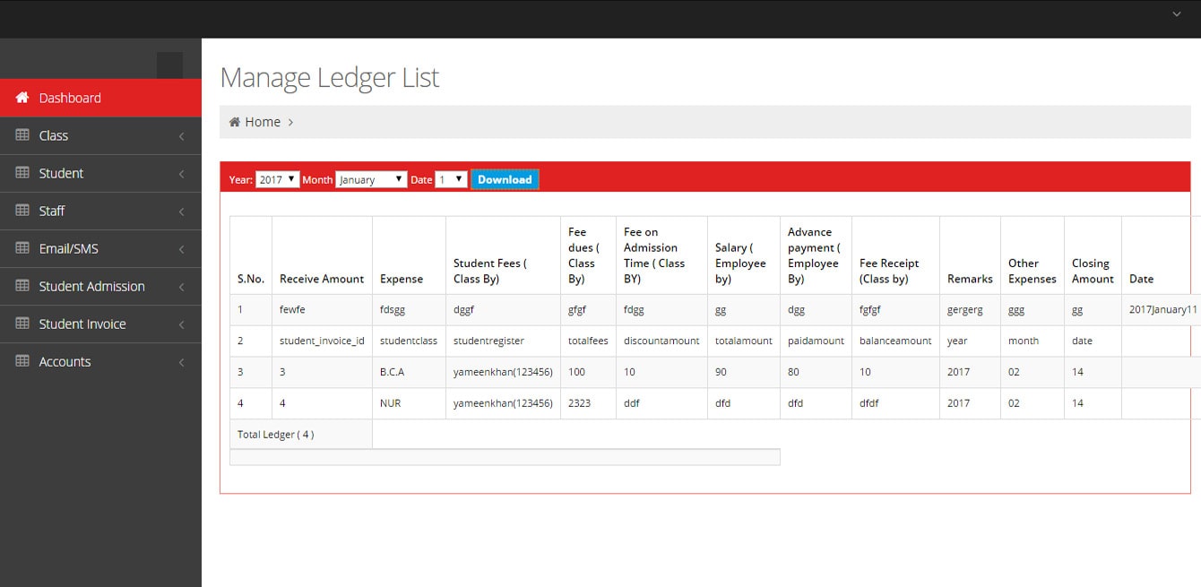 We can add student and staff detail like name, date, fee, father name, mobile no., mail id, etc.