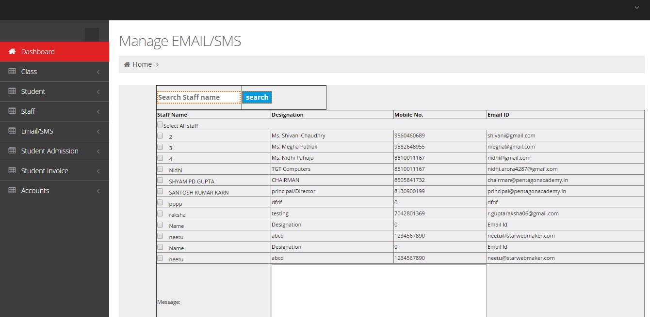 We utilize an intuitive configuration to manage student and staff information, ensuring data integrity, accurate reporting, and swift access to information. Stored data is shared across all modules and programs within your school. We can input details such as name, date, fees, father's name, mobile number, email, etc., and efficiently manage student and staff information. This system allows for the addition of student classes, as well as the tracking of attendance and leave records for both students and staff. Additionally, communication is streamlined through the capability to send emails and messages to any student or staff member.