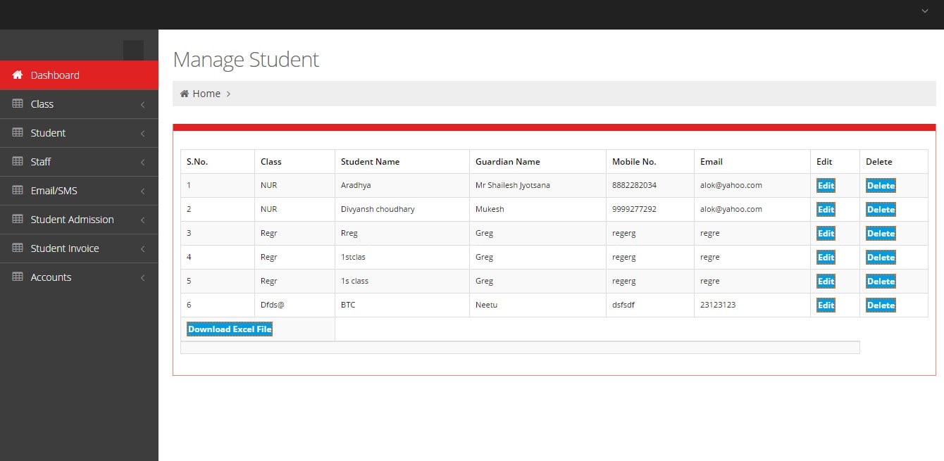 We can add student and staff detail like name, date, fee, father name, mobile no., mail id, etc.